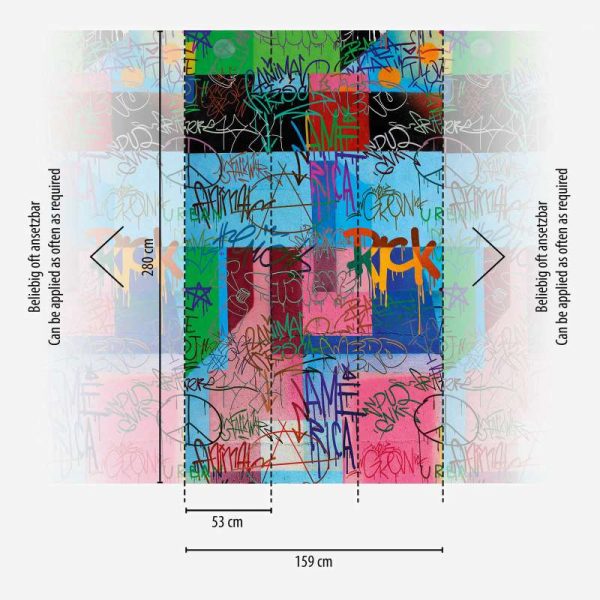 Medidas: 2,80 m x 1,59 m. (3 paneles de 0,53 m) Case: Sin case. Calidad: Tejido no tejido. Estilo: Mural de impresión digital de gran grafiti de colores. Patrón que permite repetición.