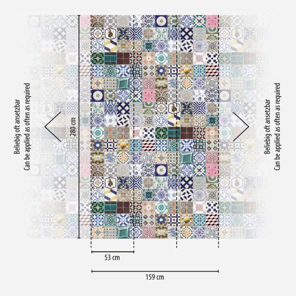Medidas: 2,80 m x 1,59 m. (3 paneles de 0,53 m) Case: Sin case. Calidad: Tejido no tejido. Estilo: Mural digital con mosaico de azulejos de estilo hidráulico. Patrón que permite repetición.