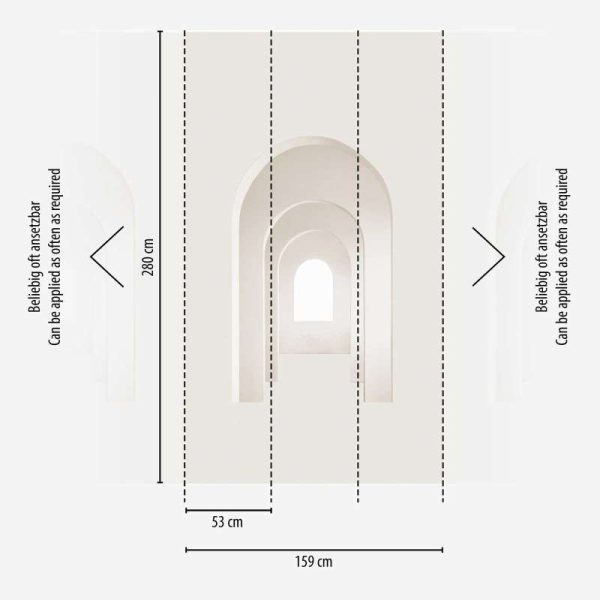 Medidas: 2,80 m x 1,59 m. (3 paneles de 0,53 m) Case: Sin case. Calidad: Tejido no tejido. Estilo: Mural digital arcos efecto ventana 3D en color blanco. Patrón que permite repetición.