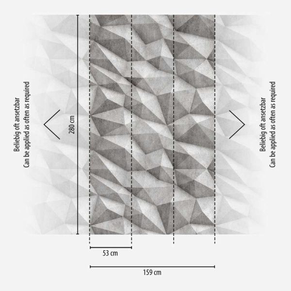 Medidas: 2,80 m x 1,59 m. (3 paneles de 0,53 m) Case: Sin case. Calidad: Tejido no tejido. Estilo: Mural digital patrón geométrico en 3D efecto hormigón. Patrón que permite repetición.