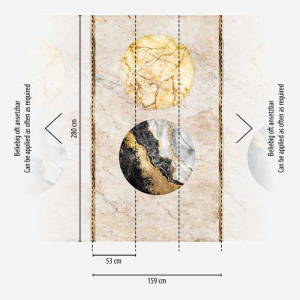 Medidas: 2,80 m x 1,59 m. (3 paneles de 0,53 m) Case: Sin case. Calidad: Tejido no tejido. Estilo: Mural digital efecto mármol con círculos en diseño de veta mármol con detalles dorados.