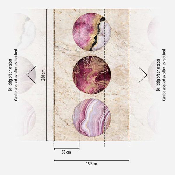 Medidas: 2,80 m x 1,59 m. (3 paneles de 0,53 m) Case: Sin case. Calidad: Tejido no tejido. Estilo: Mural digital efecto mármol con círculos en diseño de veta mármol rosado con detalles dorados.