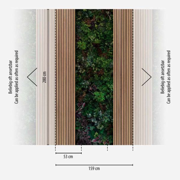 Medidas: 2,80 m x 1,59 m. (3 paneles de 0,53 m) Case: Sin case. Calidad: Tejido no tejido. Estilo: Mural digital de paneles acústicos de madera con fondo de vegetación frondosa. Patrón que permite repetición.