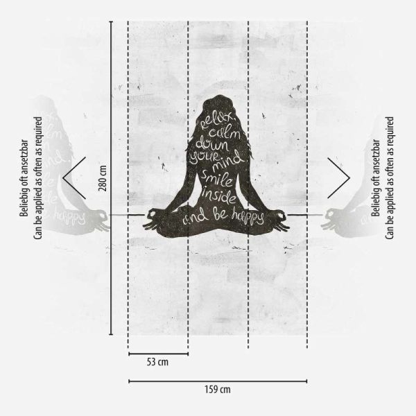 Medidas: 2,80 m x 1,59 m. (3 paneles de 0,53 m) Case: Sin case. Calidad: Tejido no tejido. Estilo: Mural digital de silueta de mujer haciendo yoga con frases inspiradoras. Patrón que permite repetición.