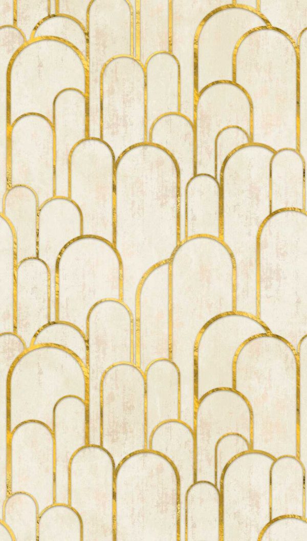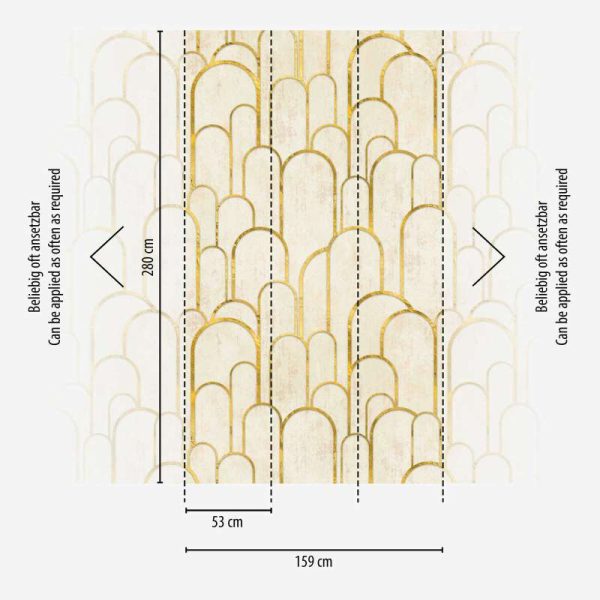 Medidas: 2,80 m x 1,59 m. (3 paneles de 0,53 m) Case: Sin case. Calidad: Tejido no tejido. Estilo: Mural digital motivos geométricos de arcos dorados estilo Art-Decò en mármol blanco. Patrón que permite repetición.