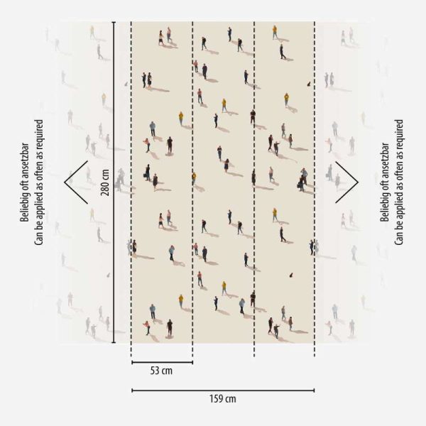 Medidas: 2,80 m x 1,59 m. (3 paneles de 0,53 m) Case: Sin case. Calidad: Tejido no tejido. Estilo: Mural digital con figuras minimalistas y dinámicas de personas caminando. Patrón que permite repetición.
