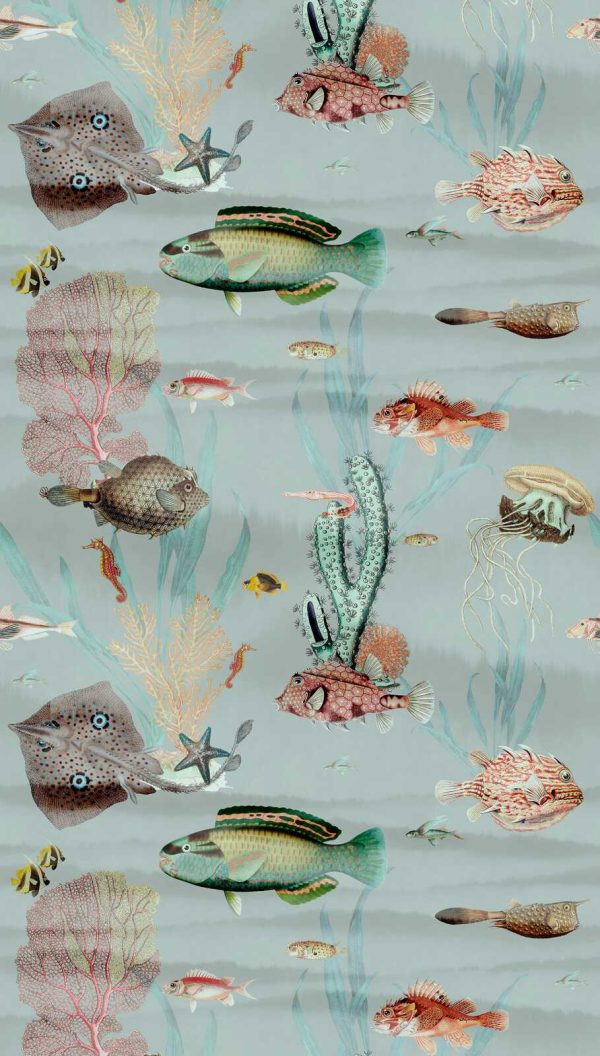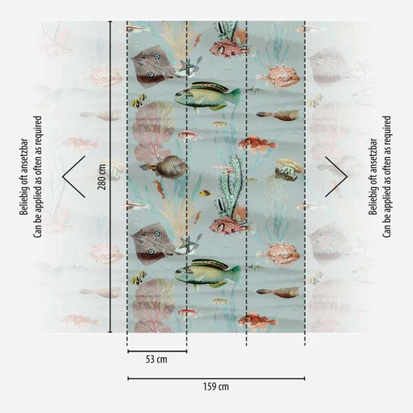 Medidas: 2,80 m x 1,59 m. (3 paneles de 0,53 m) Case: Sin case. Calidad: Tejido no tejido. Estilo: Mural digital con motivos del fondo marino con algas y peces de colores. Patrón que permite repetición.