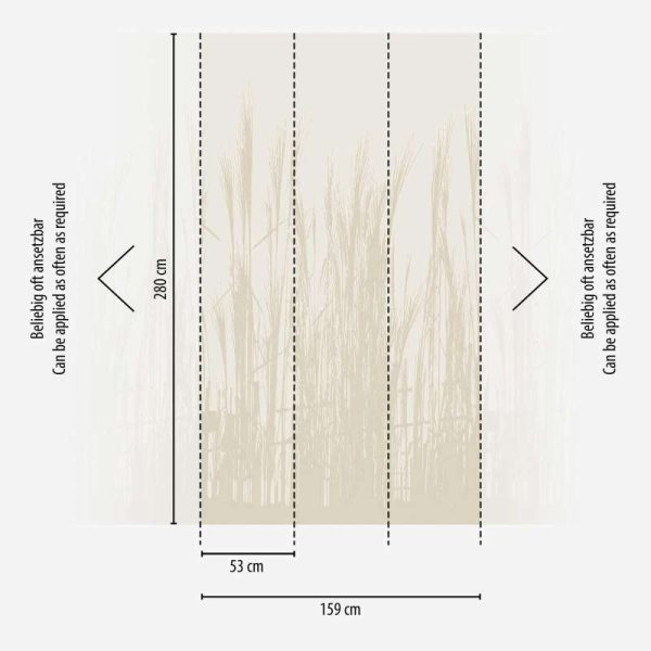 Medidas: 2,80 m x 1,59 m. (3 paneles de 0,53 m) Case: Sin case. Calidad: Tejido no tejido. Estilo: Mural digital con siluetas de juncos color beige de aspecto vintage. Patrón que permite repetición.