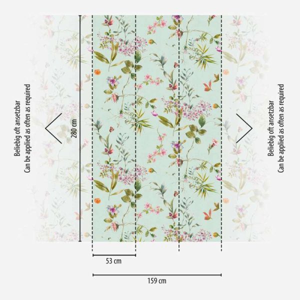 Medidas: 2,80 m x 1,59 m. (3 paneles de 0,53 m) Case: Sin case. Calidad: Tejido no tejido. Estilo: Mural digital de flores y ramilletes florales de diferentes colores sobre fondo verde pastel. Patrón que permite repetición.