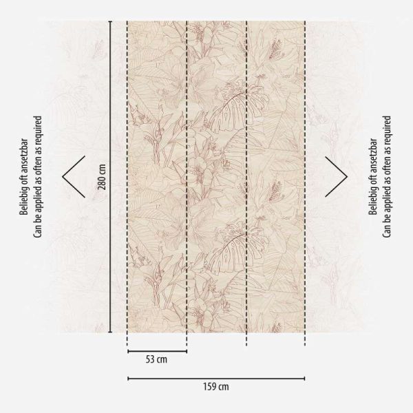 Medidas: 2,80 m x 1,59 m. (3 paneles de 0,53 m) Case: Sin case. Calidad: Tejido no tejido. Estilo: Mural digital de estilo esbozo dibujado con motivo selvático de hojas de palmera y flores . Patrón que permite repetición.