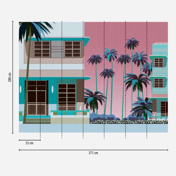 Medidas: 2,80 m x 3,71 m. (7 paneles de 0,53 m) Case: Sin case. Calidad: Tejido no tejido. Estilo: Mural digital estilo retro de edificios de colores y palmeras frente a una puesta de sol.