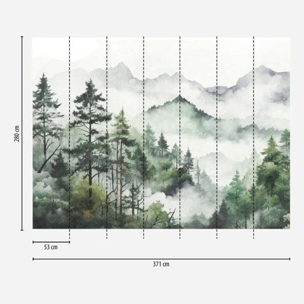 Medidas: 2,80 m x 3,71 m. (7 paneles de 0,53 m) Case: Sin case. Calidad: Tejido no tejido. Estilo: Mural digital paisaje forestal en acuarela.