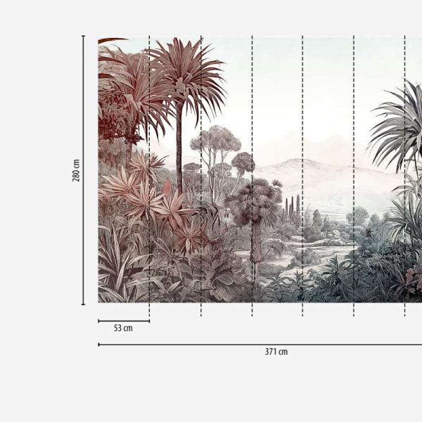 Medidas: 2,80 m x 3,71 m. (7 paneles de 0,53 m) Case: Sin case. Calidad: Tejido no tejido. Estilo: Mural digital de una selva tropical efecto degradado en tonos sepia.