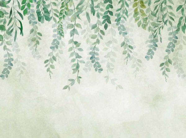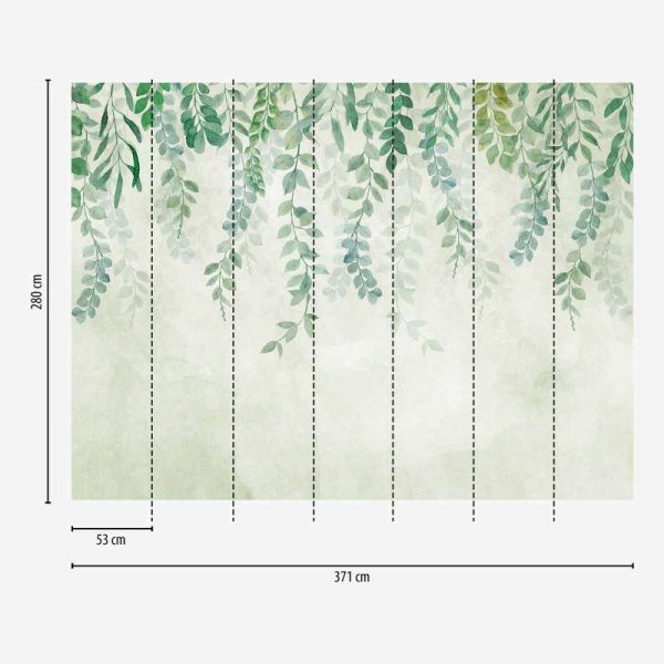 Medidas: 2,80 m x 3,71 m. (7 paneles de 0,53 m) Case: Sin case. Calidad: Tejido no tejido. Estilo: Mural digital motivos vegetales de hiedra colgante en a parte superior efecto acuarela.