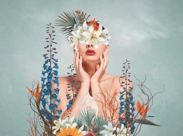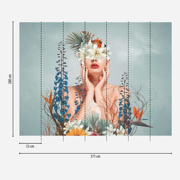 Medidas: 2,80 m x 3,71 m. (7 paneles de 0,53 m) Case: Sin case. Calidad: Tejido no tejido. Estilo: Mural digital con motivo artístico mujer con flores sobre sutil fondo azul.