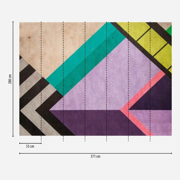 Medidas: 2,80 m x 3,71 m. (7 paneles de 0,53 m) Case: Sin case. Calidad: Tejido no tejido. Estilo: Mural digital de estética vanguardista con geometría lineal dinámica en colores turquesa, negro y lila.