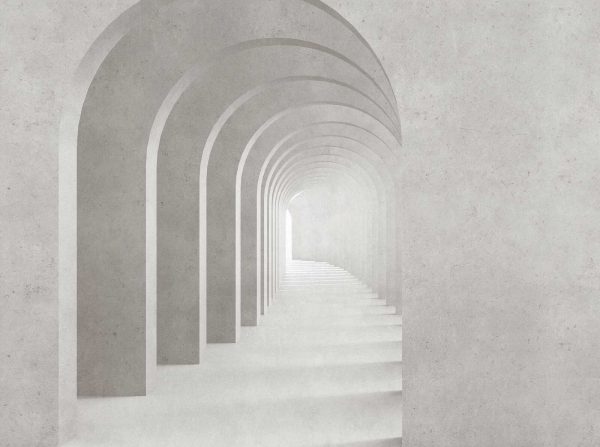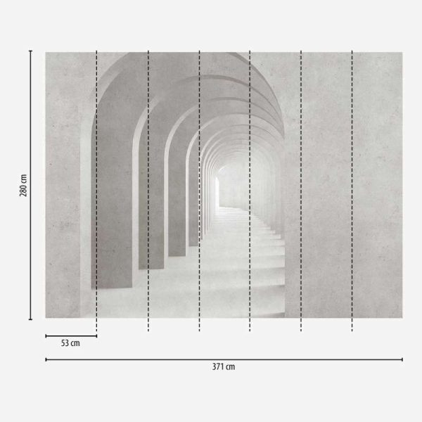 Medidas: 2,80 m x 3,71 m. (7 paneles de 0,53 m) Case: Sin case. Calidad: Tejido no tejido. Estilo: Mural digital de arquitectura dinámica con arcos y escaleras de efecto infinito en colores neutros.