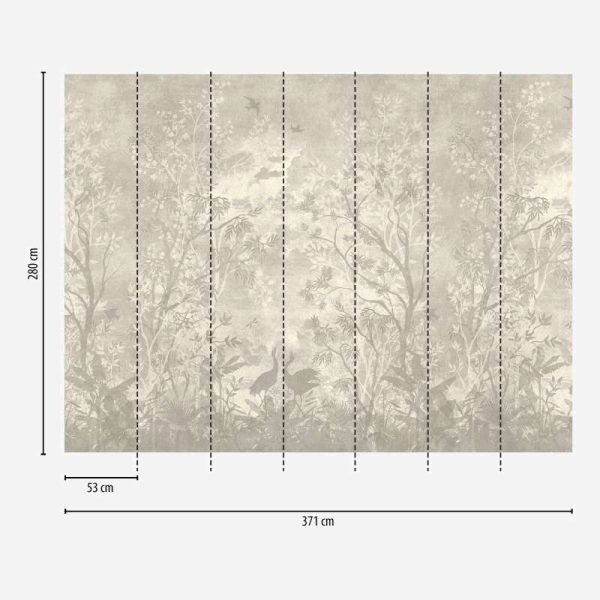 Medidas: 2,80 m x 3,71 m. (7 paneles de 0,53 m) Case: Sin case. Calidad: Tejido no tejido. Estilo: Mural digital diseño místico de un bosque con animales en tonos neutros.