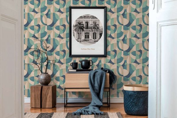 Medidas: 10,05 m x 0,53 m. Case: 53 cm (straight match-case recto). Calidad: Tejido no tejido. Estilo: Papel pintado geométrico de diseño abstracto estilo Bauhaus en colores crema, beige y azul.