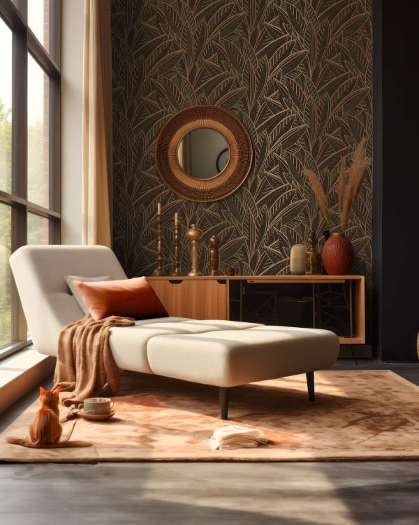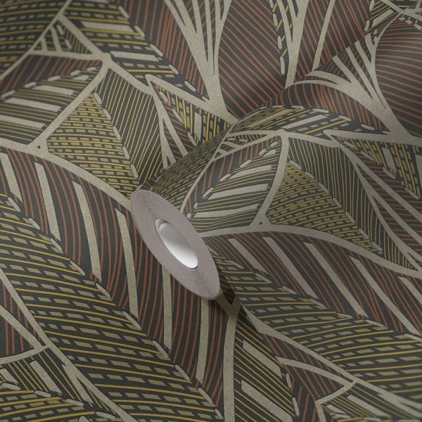 Medidas: 10,05 m x 0,53 m. Case: 64/32 cm (offset match-case salteado). Calidad: Tejido no tejido. Estilo: Papel pintado de hojas de palmera estilo Art Decò y detalles nacarados en colores marrón, verde y rojo burdeos.