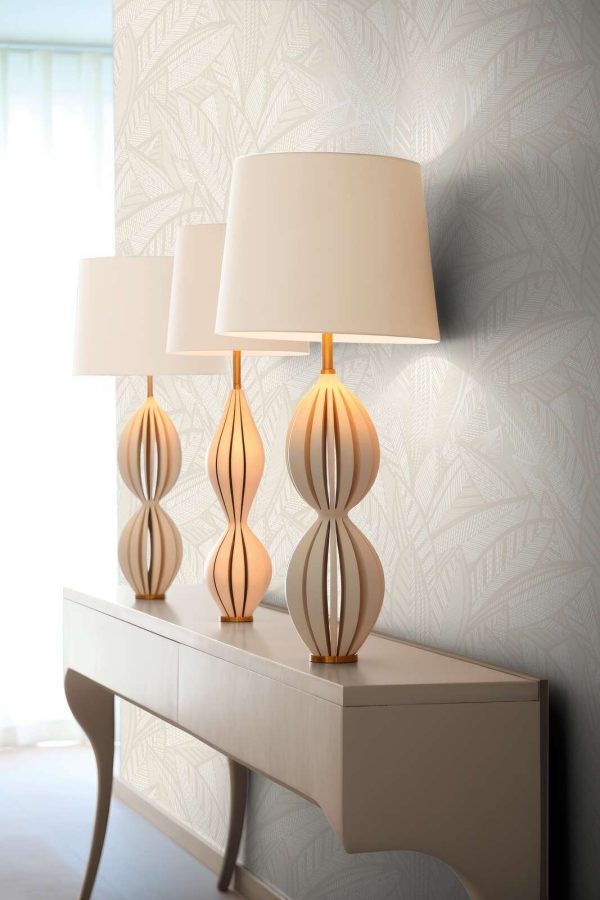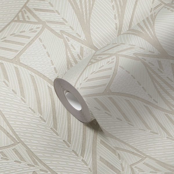 Medidas: 10,05 m x 0,53 m. Case: 64/32 cm (offset match-case salteado). Calidad: Tejido no tejido. Estilo: Papel pintado de hojas de palmera estilo Art Decò con detalles nacarados en color blanco-crema.