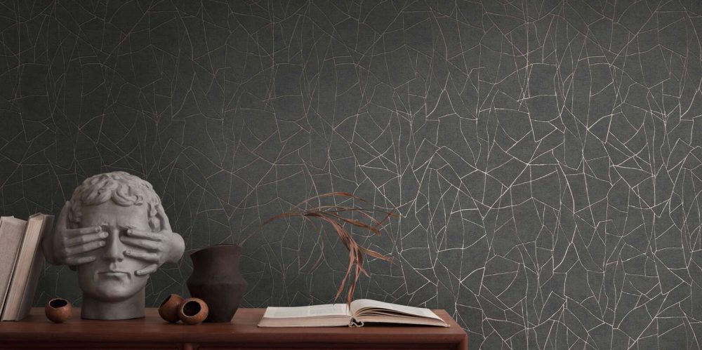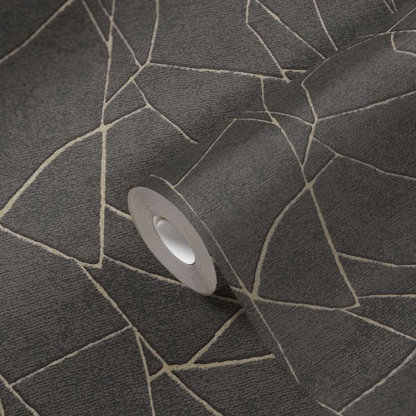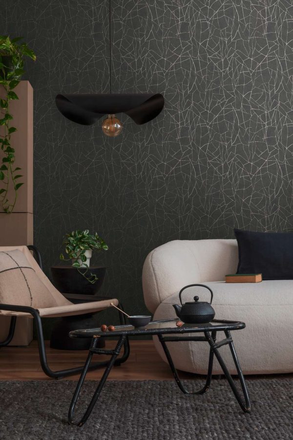 Medidas: 10,05 m x 0,53 m. Case: 64 cm (straight match-case recto). Calidad: Tejido no tejido. Estilo: Papel pintado geométrico de diseño abstracto en color negro y destellos nacarados.