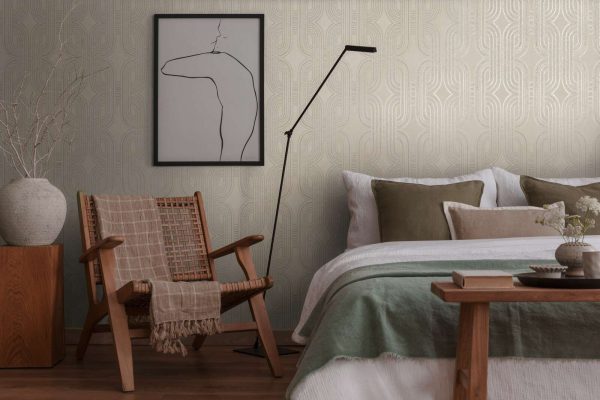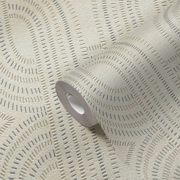 Medidas: 10,05 m x 0,53 m. Case: 32 cm (straight match-case recto). Calidad: Tejido no tejido. Estilo: Papel pintado geométrico estilo retro en color beige con destellos metalizados.