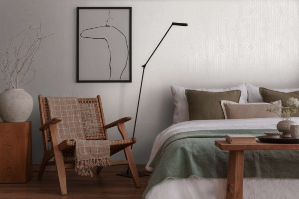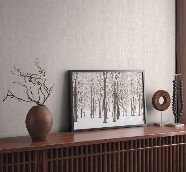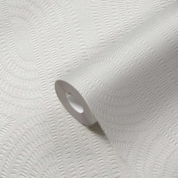 Medidas: 10,05 m x 0,53 m. Case: 32 cm (straight match-case recto). Calidad: Tejido no tejido. Estilo: Papel pintado geométrico estilo retro en color blanco.