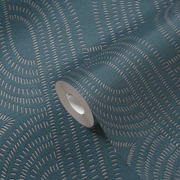 Medidas: 10,05 m x 0,53 m. Case: 32 cm (straight match-case recto). Calidad: Tejido no tejido. Estilo: Papel pintado geométrico estilo retro en color azul turquesa y beige.