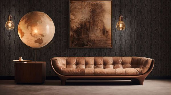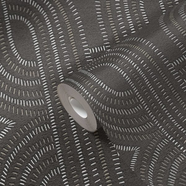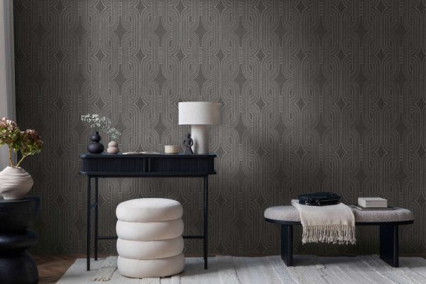 Medidas: 10,05 m x 0,53 m. Case: 32 cm (straight match-case recto). Calidad: Tejido no tejido. Estilo: Papel pintado geométrico estilo retro en color negro-marrón con destellos nacarados.
