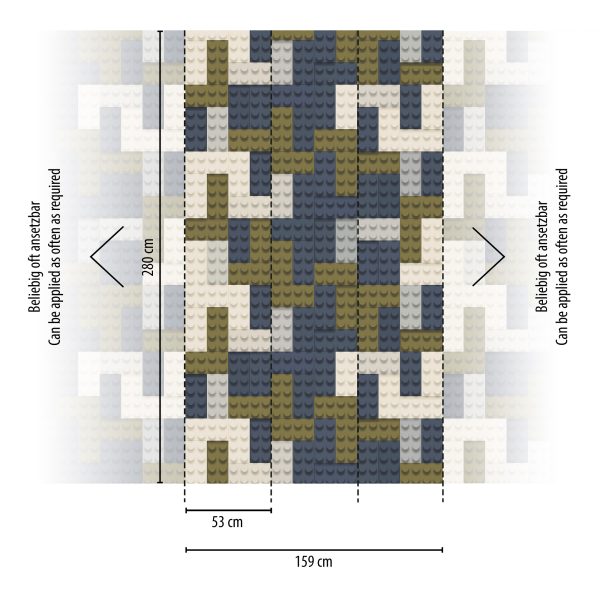 Mural de impresión digital diseño piezas de lego. Patrón que permite repetición. Medidas: 8,80 m x 0,53 m (3 paneles de 0,53 m). Case: Sin case. Calidad: Tejido no Tejido. Estilo: Infantil/Juvenil. Acabado: Mate.