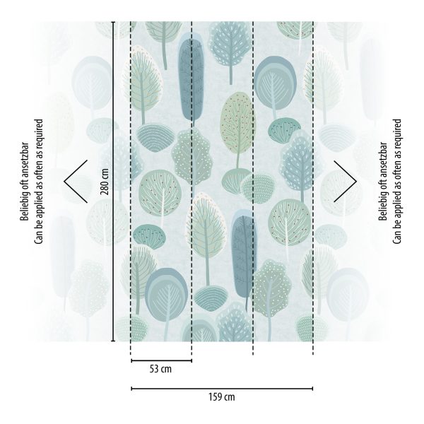 Mural de impresión digital diseño árboles mágicos. Patrón que permite repetición. Medidas: 8,80 m x 0,53 m (3 paneles de 0,53 m). Case: Sin case. Calidad: Tejido no Tejido. Estilo: Infantil/Juvenil. Acabado: Mate.
