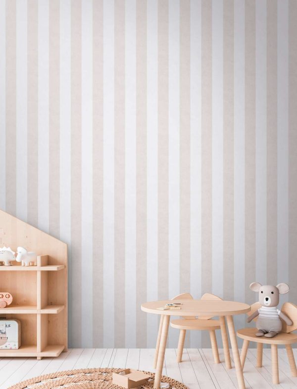 Papel pintado de rayas de 8,5 cm de ancho en color beige y crema. Medidas: 10,05 m x 0,53 m. Case: Sin case. Calidad: Tejido no Tejido. Estilo: Infantil/Juvenil. Geométrico/Rayas. Acabado: Mate.