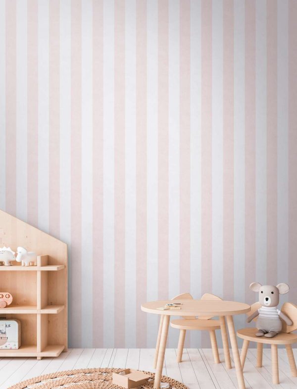 Papel pintado de rayas de 8,5 cm de ancho en color rosa y crema. Medidas: 10,05 m x 0,53 m. Case: Sin case. Calidad: Tejido no Tejido. Estilo: Infantil/Juvenil. Geométrico/Rayas. Acabado: Mate.