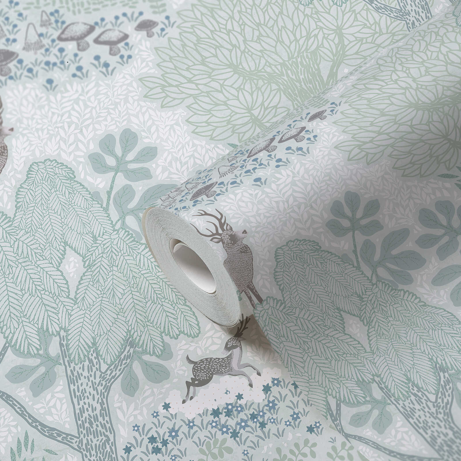 Papel pintado infantil diseño naturaleza con animales del bosque en suaves tonos verdes. Medidas: 10,05 m x 0,53 m. Case: 53 / 26 cm (case salteado). Calidad: Tejido no Tejido. Estilo: Infantil/Juvenil. Acabado: Mate.
