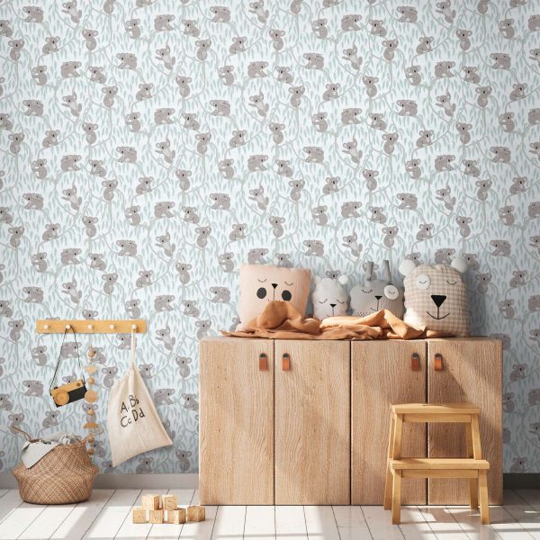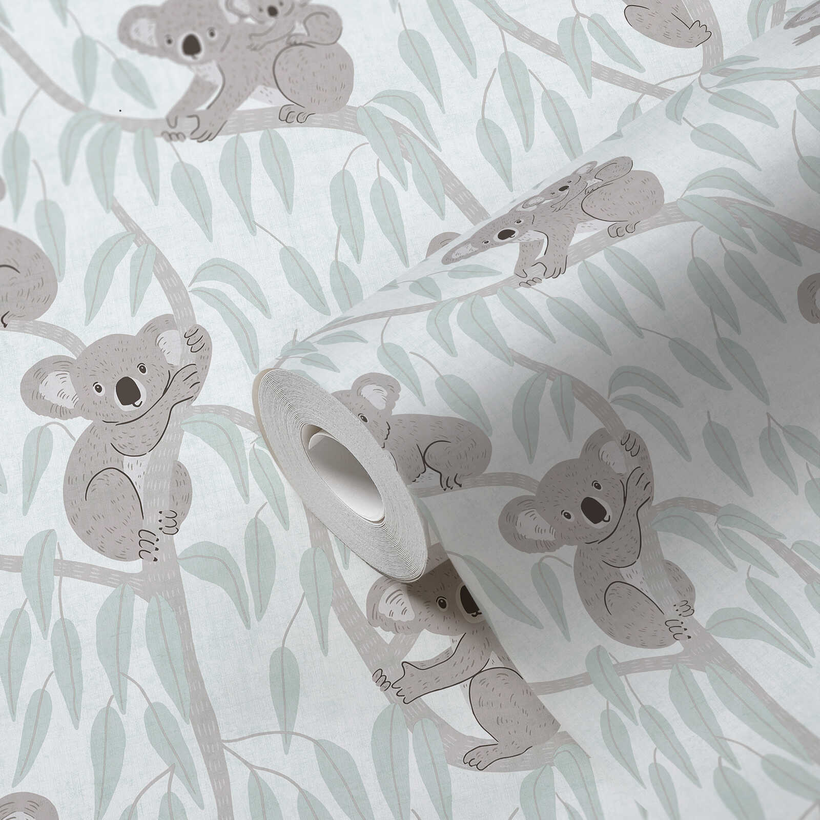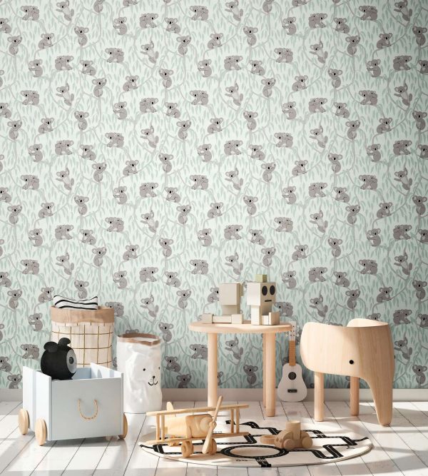 Papel pintado infantil diseño koalas en rama de eucalipto en color verde y gris. Medidas: 10,05 m x 0,53 m. Case: 53 / 26 cm (case salteado). Calidad: Tejido no Tejido. Estilo: Infantil/Juvenil. Acabado: Mate.