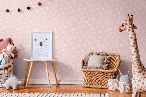 Papel pintado infantil diseño moderno de círculos y topos en color rosa. Medidas: 10,05 m x 0,53 m. Case: 53 cm (case recto). Calidad: Tejido no Tejido. Estilo: Infantil/Juvenil. Acabado: Mate.