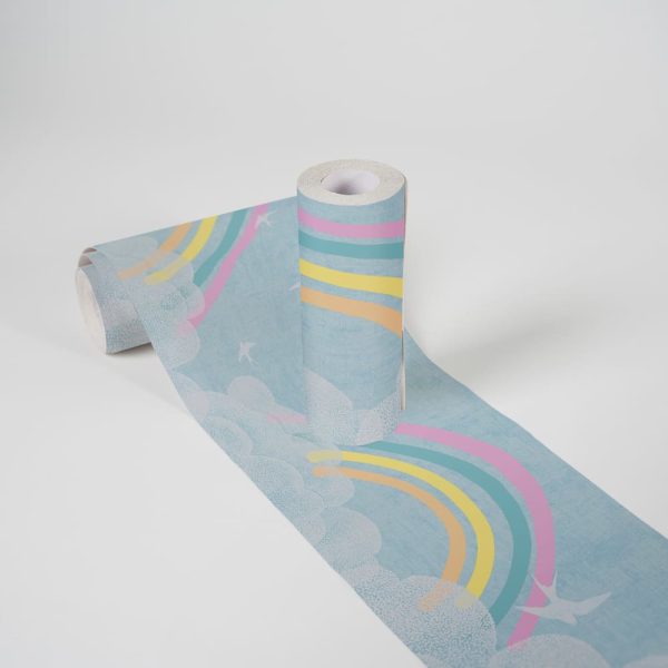 Cenefa infantil (13 cm de ancho) diseño de nubes y arcoiris en cielo azul.