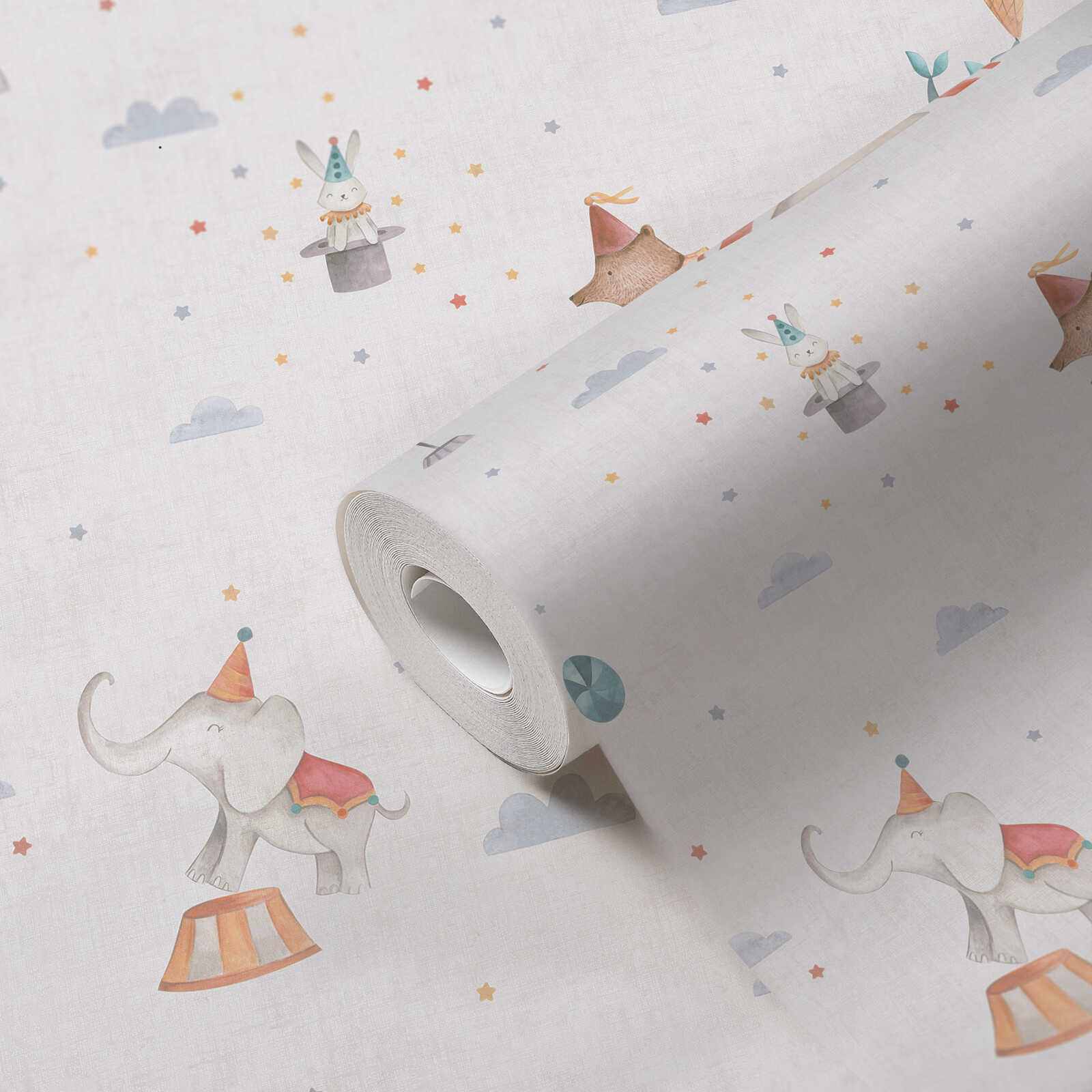 Papel pintado infantil diseño de alegres y divertidos animales en el circo. Medidas: 10,05 m x 0,53 m. Case: 64/32 cm (case salteado). Calidad: Tejido no Tejido. Estilo: Infantil/Juvenil. Acabado: Mate.