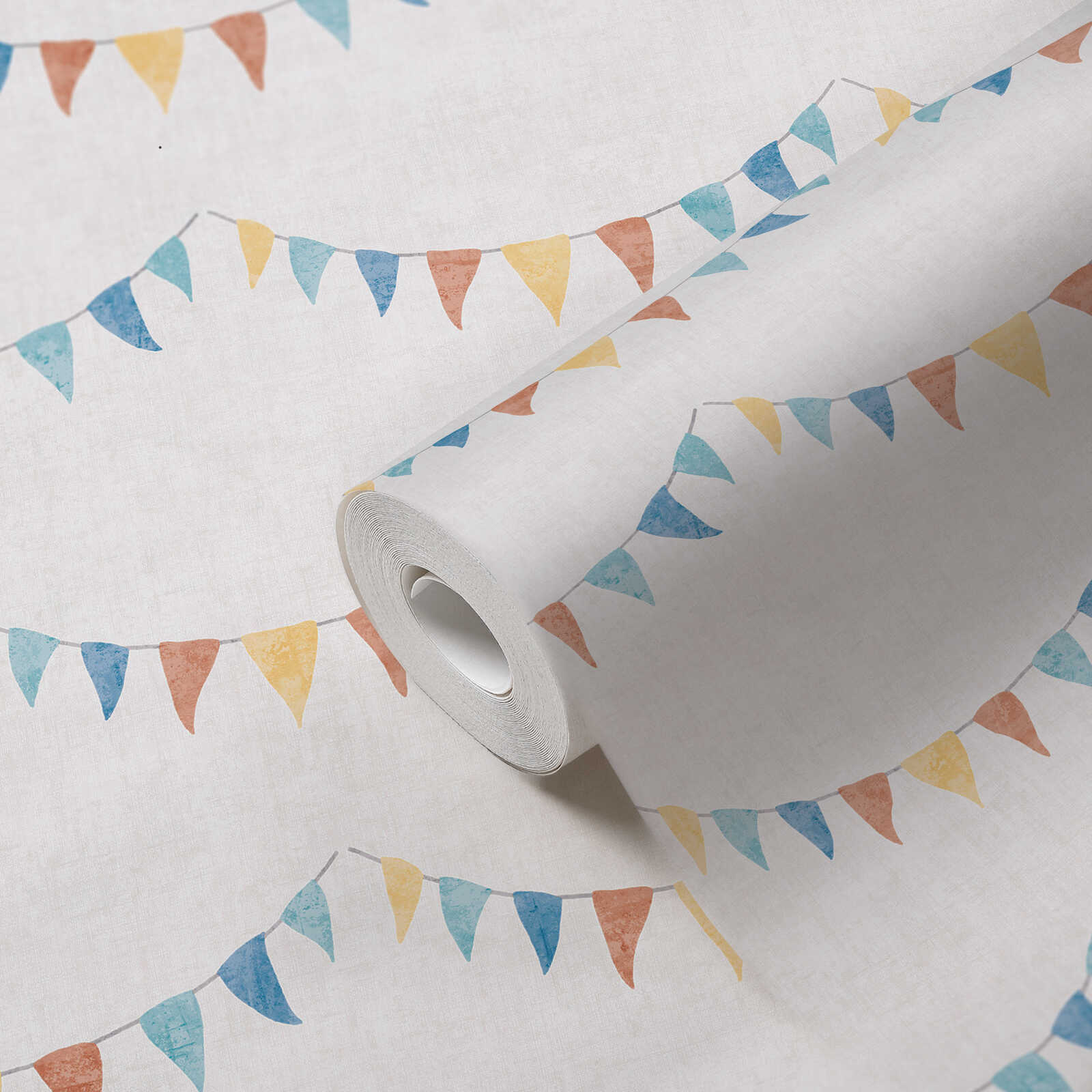 Papel pintado infantil diseño de guirnaldas con banderines de colores. Medidas: 10,05 m x 0,53 m. Case: 53 cm (case recto). Calidad: Tejido no Tejido. Estilo: Infantil/Juvenil. Acabado: Mate.