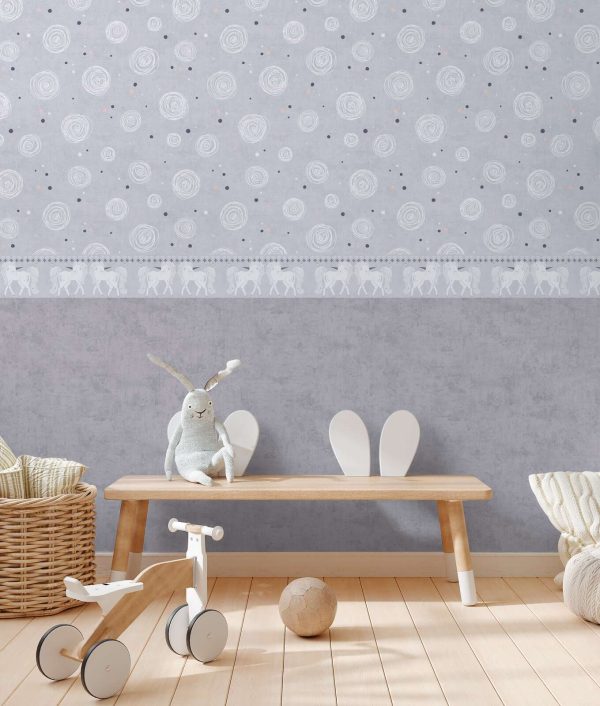 Papel pintado infantil liso en color gris, ideal para complementar con diseños infantiles. Medidas: 10,05 m x 0,53 m. Case: Sin case. Calidad: Tejido no Tejido. Estilo: Infantil/Juvenil. Acabado: Mate.