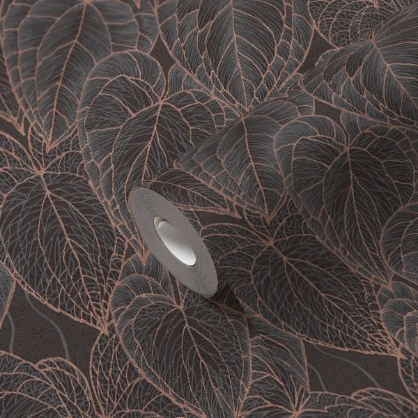 Papel pintado floral diseño hojas en color negro con detalles metalizados. Medidas: 10,05 m x 0,53 m. Case: 64 / 32 cm (case salteado). Calidad: Tejido no Tejido.Estilo: Romantic Chic.Acabado: Vinilo Texturado.