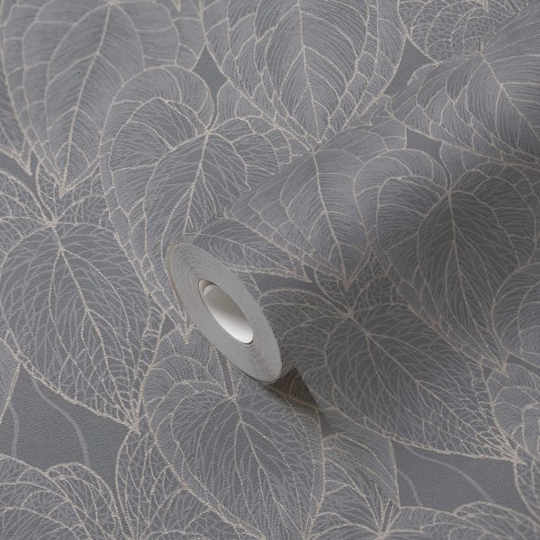 Papel pintado floral diseño hojas en color gris con detalles metalizados. Medidas: 10,05 m x 0,53 m. Case: 64 / 32 cm (case salteado). Calidad: Tejido no Tejido.Estilo: Romantic Chic.Acabado: Vinilo Texturado.