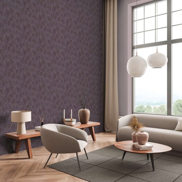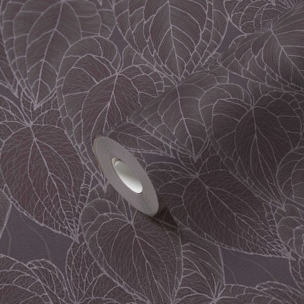 Papel pintado floral diseño hojas en color gris púrpura con detalles metalizados. Medidas: 10,05 m x 0,53 m. Case: 64 / 32 cm (case salteado). Calidad: Tejido no Tejido.Estilo: Romantic Chic.Acabado: Vinilo Texturado.