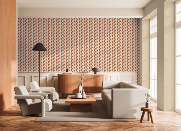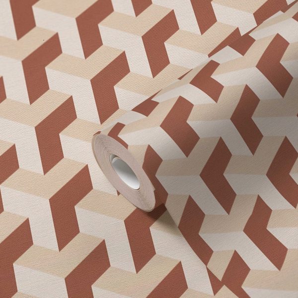 Papel pintado geométrico efecto 3D en colores naranja y beige con detalles metálicos. Medidas: 10,05 m x 0,53 m. Case: 64 / 32 cm (case salteado). Calidad: Tejido no Tejido. Estilo: Geométrico/Rayas. Acabado: Vinilo Texturado.