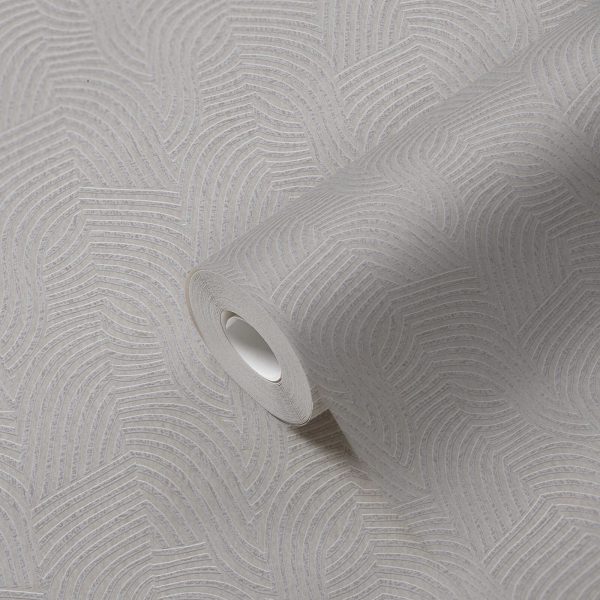 Papel pintado geométrico diseño ondas estilo retro en color gris con efecto nacarado. Medidas: 10,05 m x 0,53 m. Case: 64 / 32 cm (case salteado). Calidad: Tejido no Tejido.Estilo: Retro Chic. Geométrico/Rayas.Acabado: Vinilo Espumado.