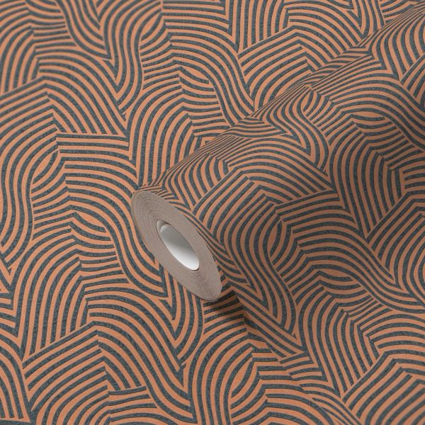 Papel pintado geométrico diseño ondas estilo retro en color naranja y negro efecto nacarado. Medidas: 10,05 m x 0,53 m. Case: 64 / 32 cm (case salteado). Calidad: Tejido no Tejido.Estilo: Retro Chic. Geométrico/Rayas.Acabado: Vinilo Espumado.
