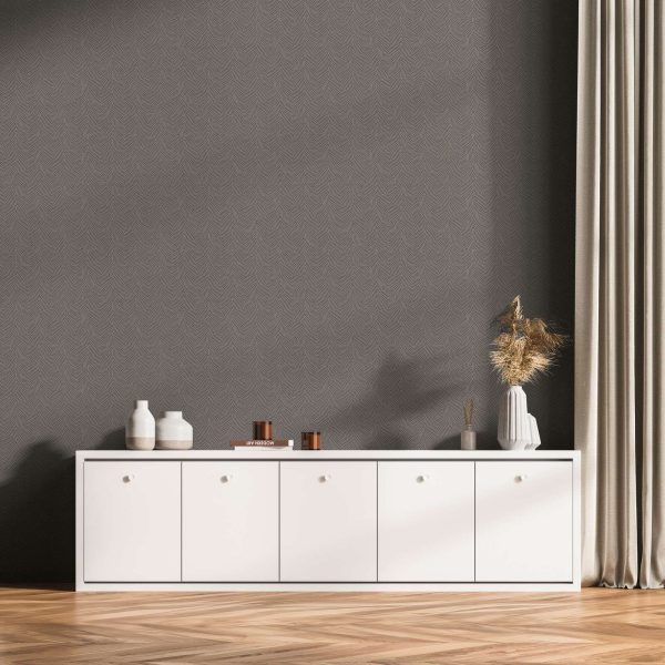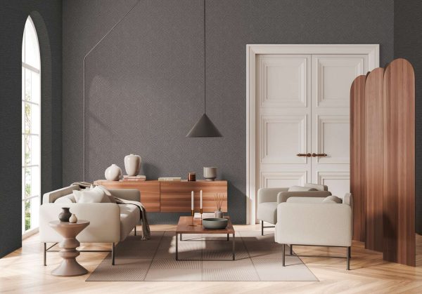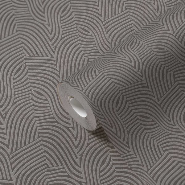 Papel pintado geométrico diseño ondas estilo retro en color gris y negro efecto nacarado. Medidas: 10,05 m x 0,53 m. Case: 64 / 32 cm (case salteado). Calidad: Tejido no Tejido.Estilo: Retro Chic. Geométrico/Rayas.Acabado: Vinilo Espumado.