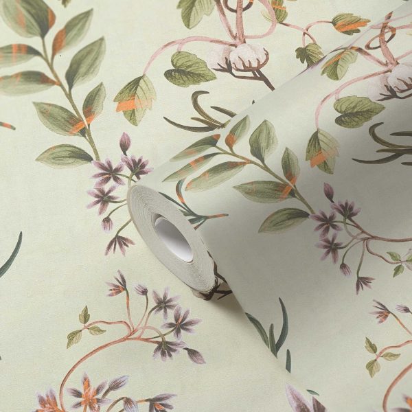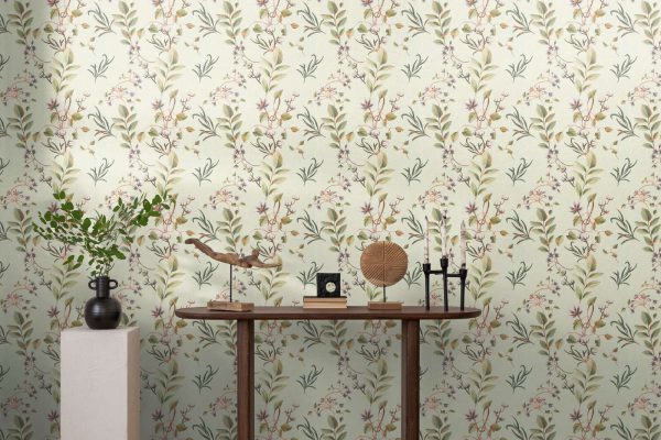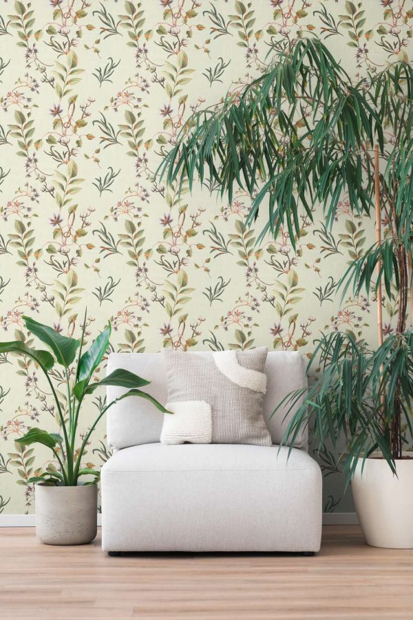 Papel pintado estilo floral con efecto pintado a mano en diferentes colores, sobre fondo crema.