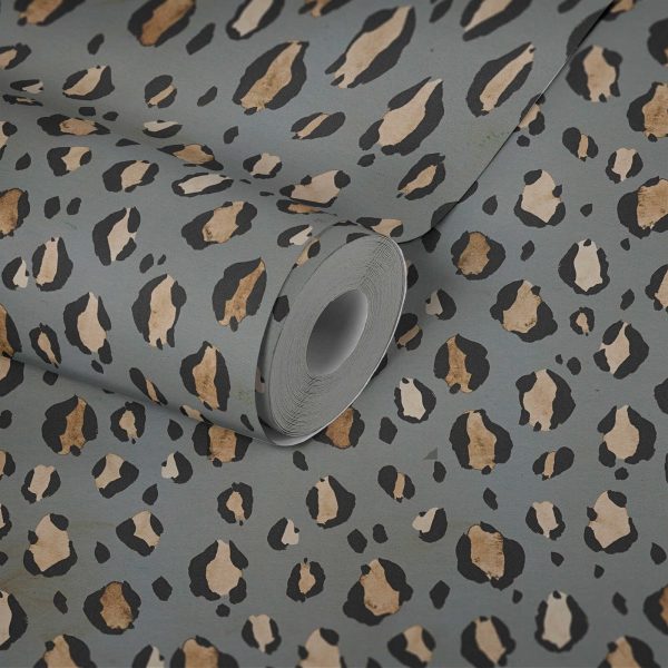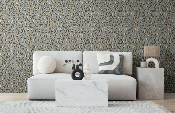 Papel pintado diseño animal print (leopardo) fondo color gris. Medidas: 10,05 m x 0,53 m. Case: 53 cm (case recto). Calidad: Tejido no Tejido. Estilo: Boho Chic. Diseños/Tendencias. Acabado: Vinílico mate.
